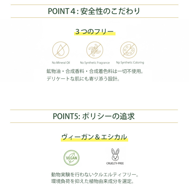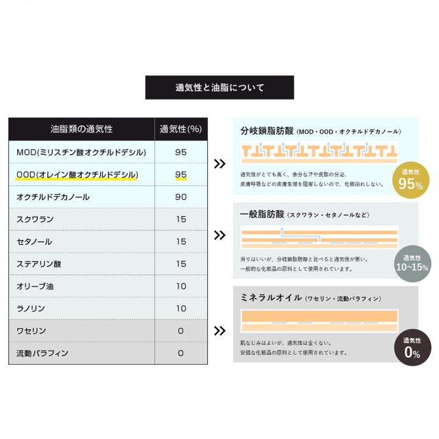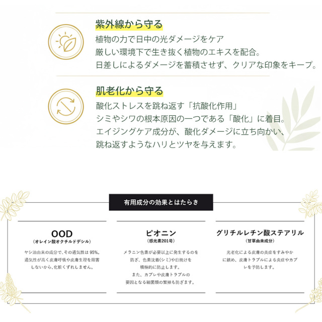 | 表示成分 | オレイン酸オクチルドデシル(OOD)、グリチルレチン酸ステアリル(甘草由来成分)、コムギ胚芽油、テトラヘキシルデカン酸アスコルビル、酢酸トコフェロール、クオタニウム-73(感光素201号)、ブチルパラベン |