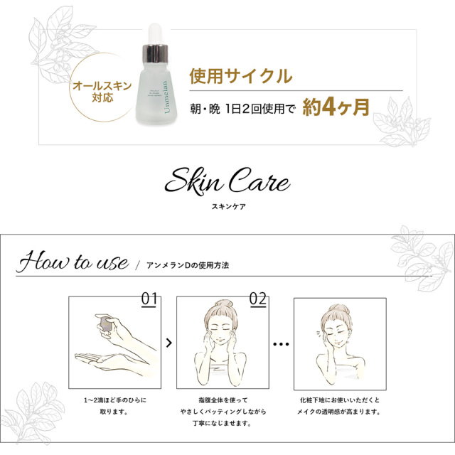 | 使用方法 | 1~2滴ほどを手のひらに取り、指腹全体を使ってやさしくパッティングしながら丁寧になじませてください。 ※化粧下地にお使いいただくとメイクの透明感が高まります。 |